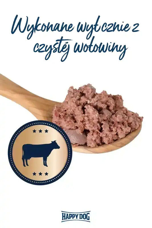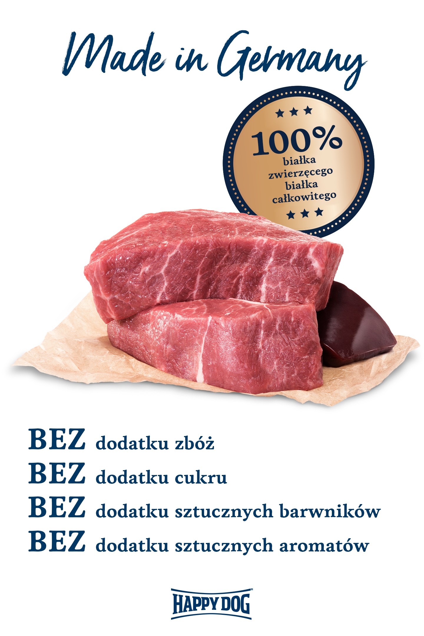 Z karmą mokrą Happy Dog Sensible Pure Germany rozpieszczasz swojego psa częścią czystej natury. Ta mokra karma premium składa się w 100 % z wartościowego mięsa oraz podrobów takich jak serca, płuca i wątroba i zawiera wysokiej jakości witaminy i minerały. Przy czym mięso i podroby pochodzą wyłącznie z wołowiny*. Ta karma mokra jest produkowana bez soi i innych dodatków roślinnych.