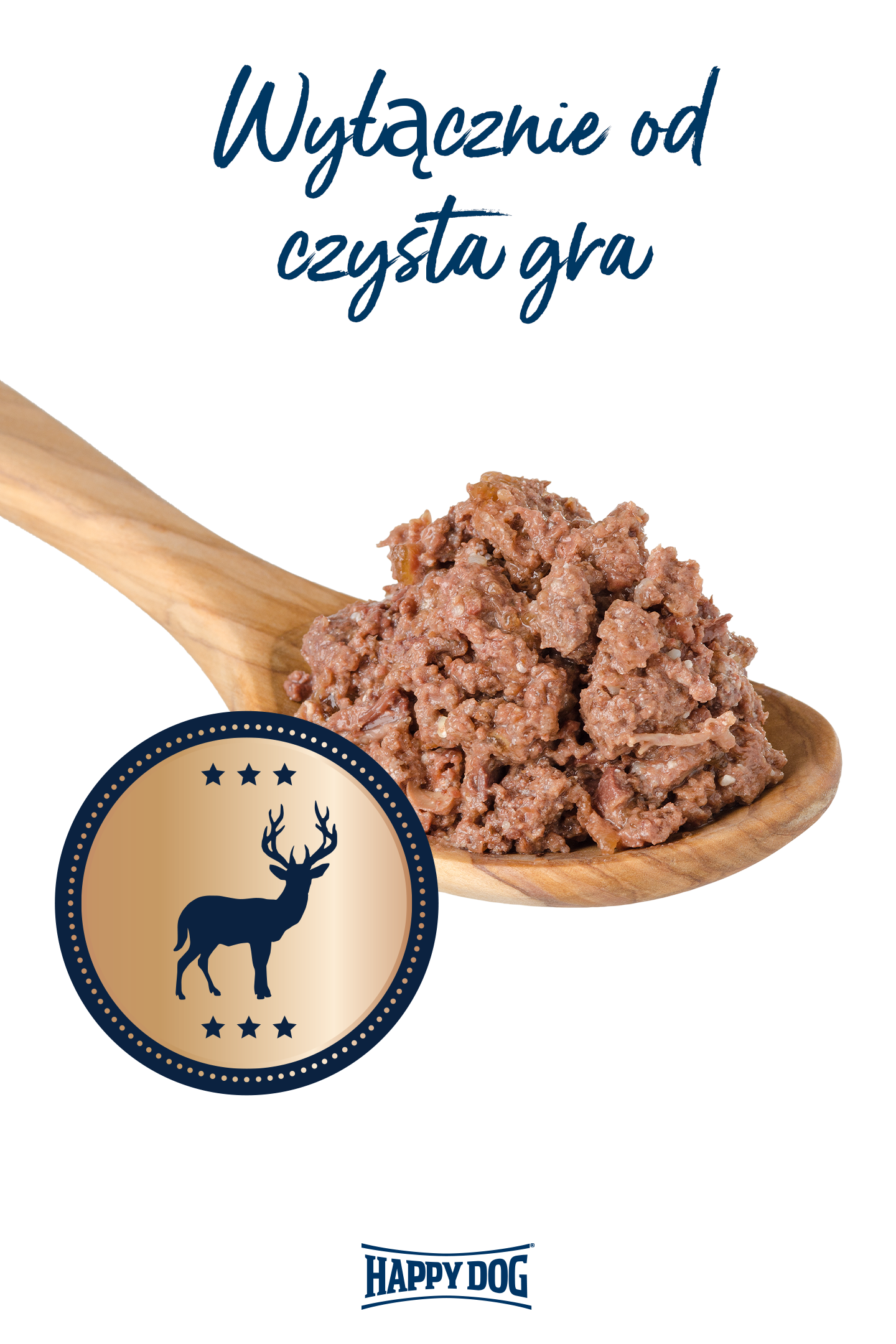 Z karmą mokrą Happy Dog Sensible Pure Sweden Twój pies doświadcza pełni natury w misce! Ta wysokiej jakości mokra karma składa się w 100 % z wartościowego mięsa oraz podrobów takich jak serca, płuca i wątroba i zawiera ważne dla życia witaminy i minerały. Przy czym mięso i podroby pochodzą wyłącznie z lokalnej dziczyzny*. Ta karma mokra jest produkowana bez soi i innych dodatków roślinnych.