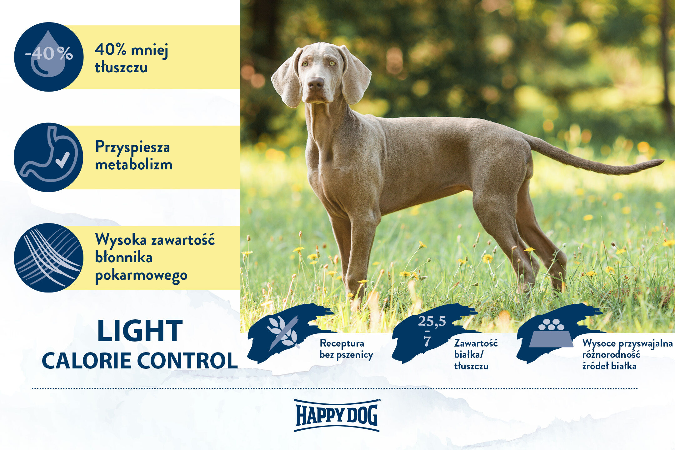 Happy Dog fit & vital Light Calorie Control jest doskonale dostosowana do potrzeb psów, które wymagają diety niskotłuszczowej dla utrzymania prawidłowej budowy ciała oraz dla utrzymania wagi, np. po przebytej diecie. Pyszna, pozbawiona pszenicy karma pełnoporcjowa zawierająca tylko 7 % tłuszczu z L-karnityną wspomaga przemianę materii i opiera się na unikalnej Happy Dog Natural Life Concept®. Dzięki wysokiej zawartości błonnika ta karma sucha jest szczególnie sycąca.