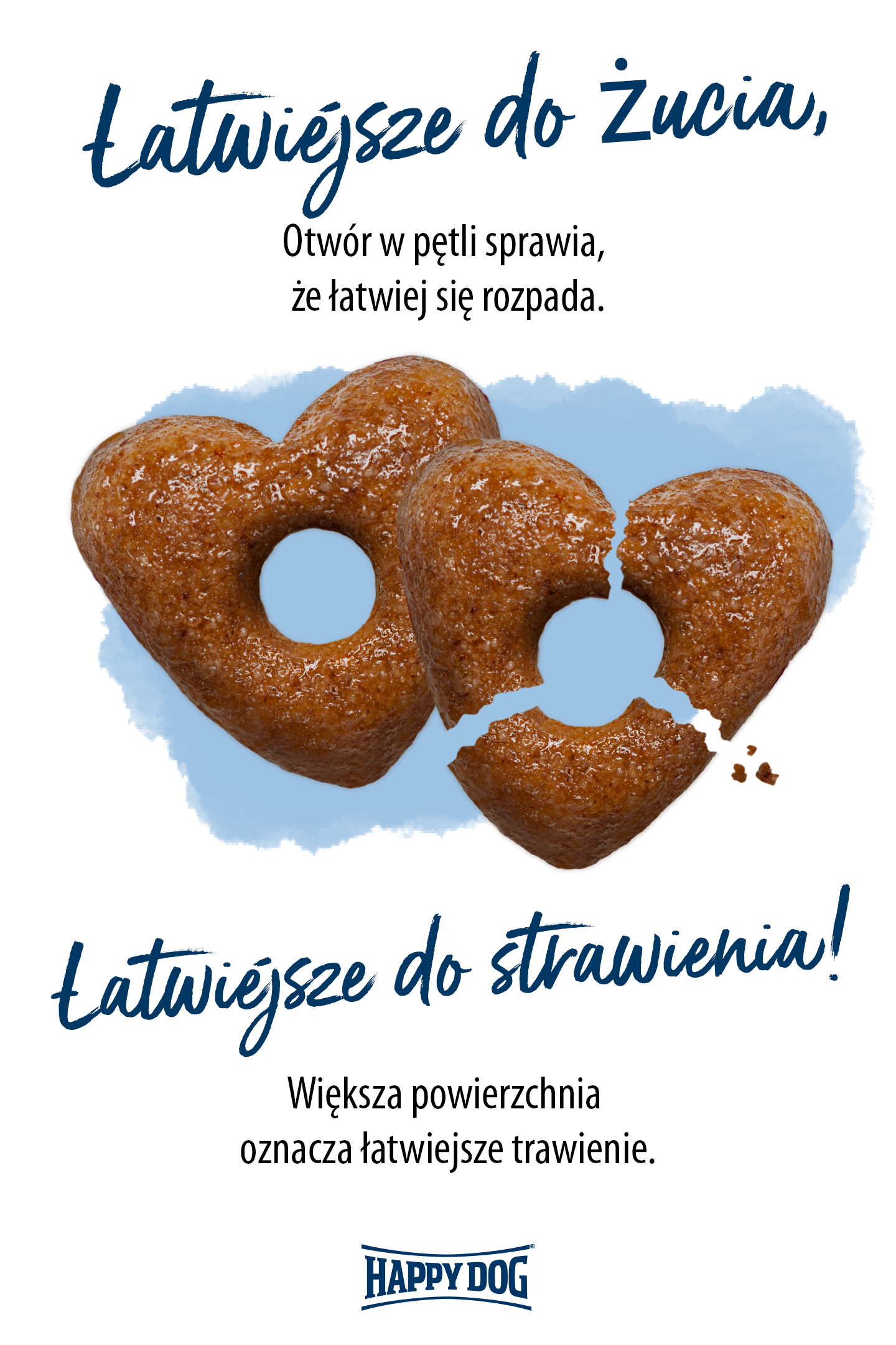 Krokiety w karmie dla szczeniąt są w kształcie serca i mają dziurkę w środku. Dzięki temu Twój szczeniak szybciej rozgryza karmę na kawałki i lepiej żuje. Dzięki większej powierzchni karma jest optymalnie rozkładana przez soki żołądkowe. Wspomaga to dobre trawienie.