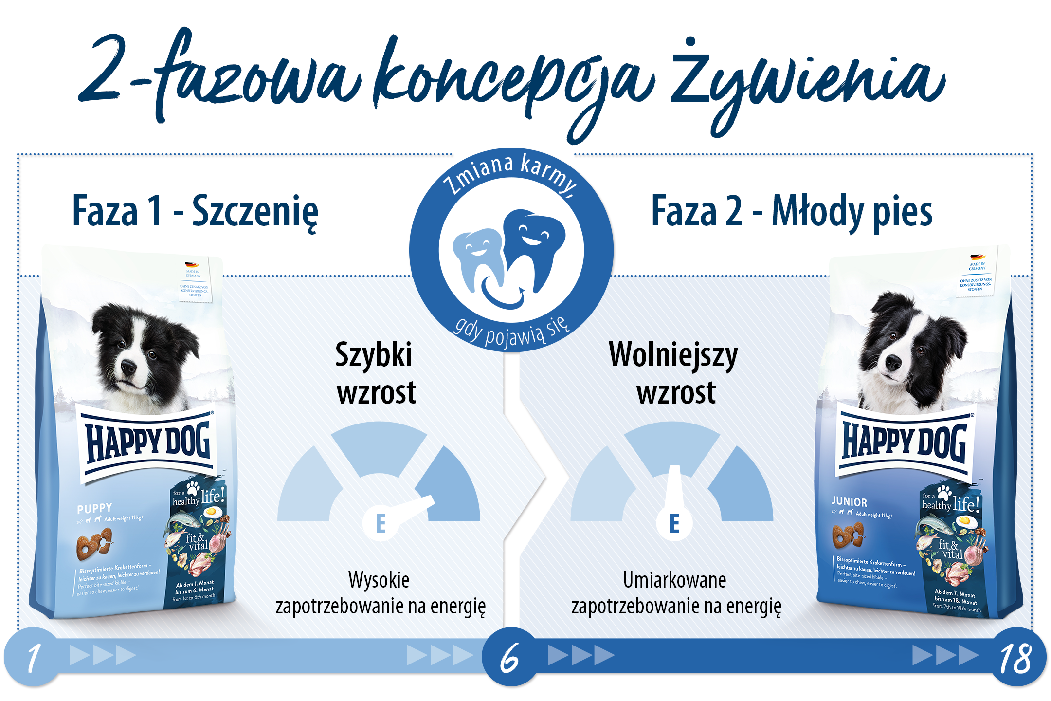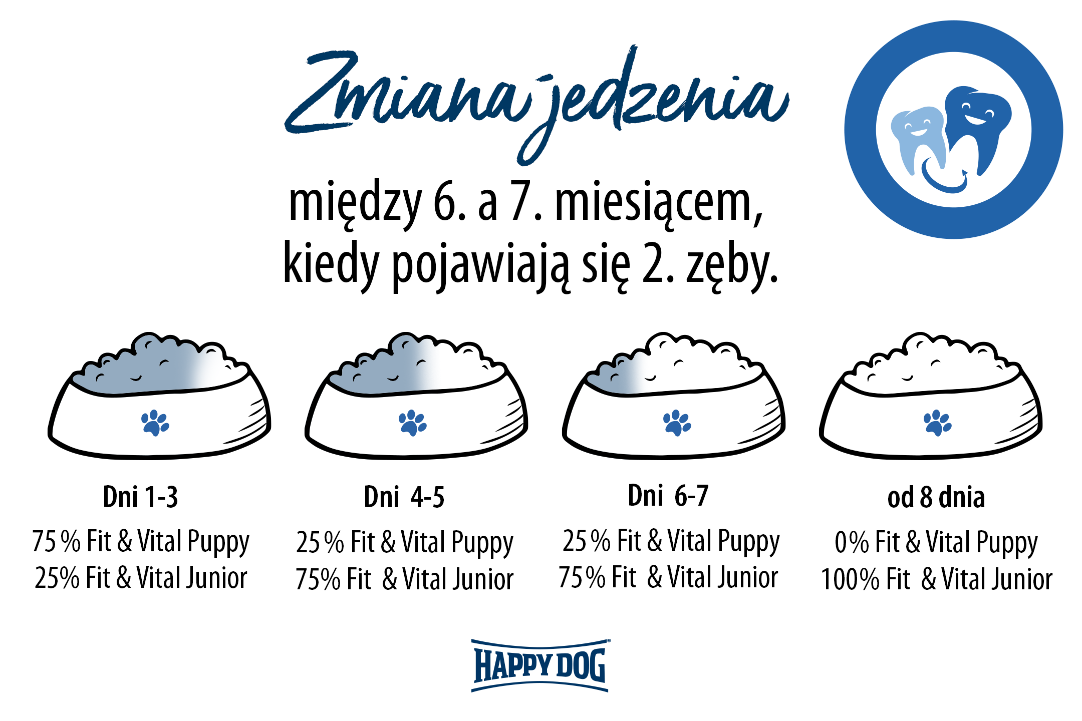 Twój czworonożny towarzysz rośnie szczególnie szybko do około 6. miesiąca życia. Po tym okresie rozpoczyna się faza młodego psa z umiarkowanym wzrostem. Na tym etapie przejdź na karmę dla psów, która jest odpowiednia dla tej fazy, np. nasza fit & vital Junior. Przyzwyczajaj swojego psa do nowej karmy powoli, podając mu przez kilka dni nową karmę z dotychczasową karmą, codziennie zwiększając udział nowej, a zmniejszając dotychczasowej. Dzięki temu układ żołądkowo-jelitowy Twojego psa może dobrze przystosować się do zmiany.