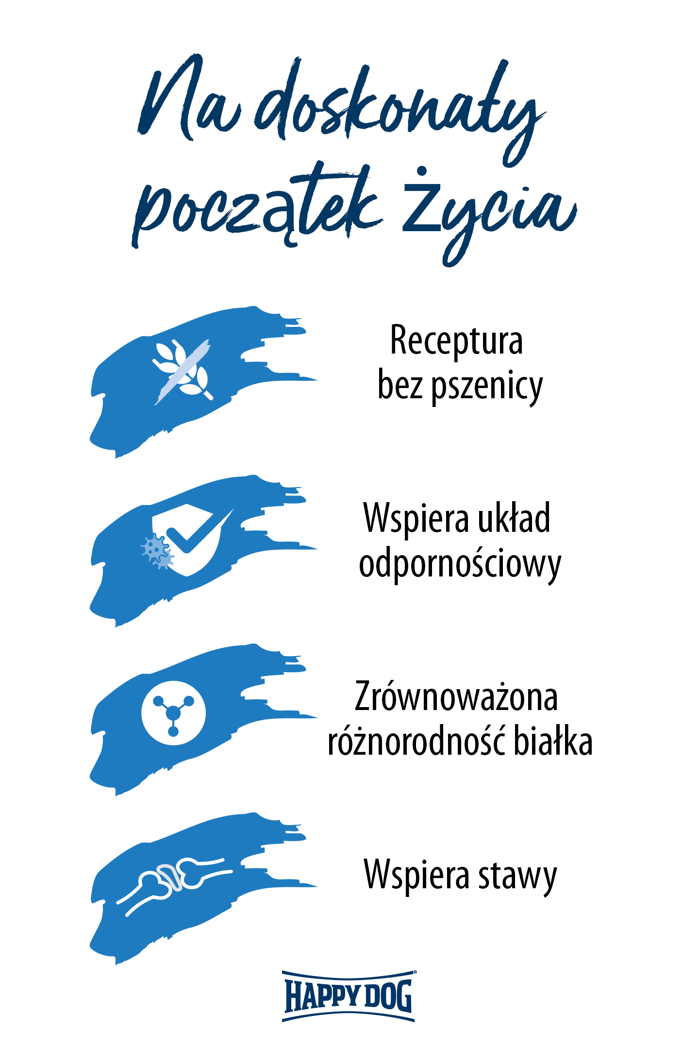 W ważnej pierwszej fazie życia, od pierwszego do szóstego miesiąca życia, Twój szczeniak rośnie szczególnie intensywnie. Potrzebuje więc więcej składników odżywczych, aby się zdrowo rozwijać. Zbilansowana karma dla szczeniąt fit & vital Puppy od Happy Dog wspiera zdrowy rozwój Twojego nowego członka rodziny. Smaczna pełnoporcjowa karma oferuje białka z 5 wybranych produktów zwierzęcych. Karma dostarcza szczeniakowi również wielu naturalnych składników odżywczych: Siemię lniane zawiera kwasy tłuszczowe omega-3 i omega-6, które wspierają lśniącą sierść i zdrową skórę. Zawarty w karmie imbir wzmacnia układ odpornościowy i jest podobnie jak mięso małży nowozelandzkich, dobry dla stawów szczeniaka. Optymalna zatem w głównej fazie wzrostu.