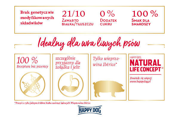 Happy Dog Andalucía jest idealna dla wszystkich wymagających, dorosłych smakoszy od 11 kg, którzy szukają urozmaicenia lub są bardzo wybredni.