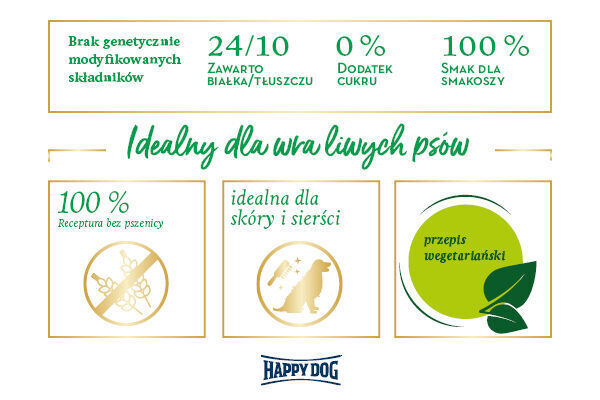 Zapewnijwegetariańską recepturę z dobrze tolerowanego ryżu i groszku dla urozmaicenia w misce Twojego psa. Prawdziwy przysmak, który wspiera lśniącą sierść i nienaruszoną barierę ochronną skóry między innymi dzięki wielu kwasom tłuszczowym omega-3 i 6. W połączeniu z cennymi właściwościami żurawiny, kokosa i kurkumy stanowi idealną karmę dla wymagających i wrażliwych smakoszy średnich i dużych ras. Oprócz lekkostrawnego i optymalnie tolerowanego ryżu, Happy Dog India zawiera drobny groszek, który charakteryzuje się wysoką zawartością białka i błonnika. W połączeniu z kurkumą składniki te wspomagają trawienie. Dodatkowo żurawina dostarcza cennych witamin i antyoksydantów, które mogą wiązać wolne rodniki i zapewnić aktywną ochronę komórek. Kokos jest bogaty w cenne kwasy tłuszczowe, dzięki czemu wspomaga skórę i sierść.