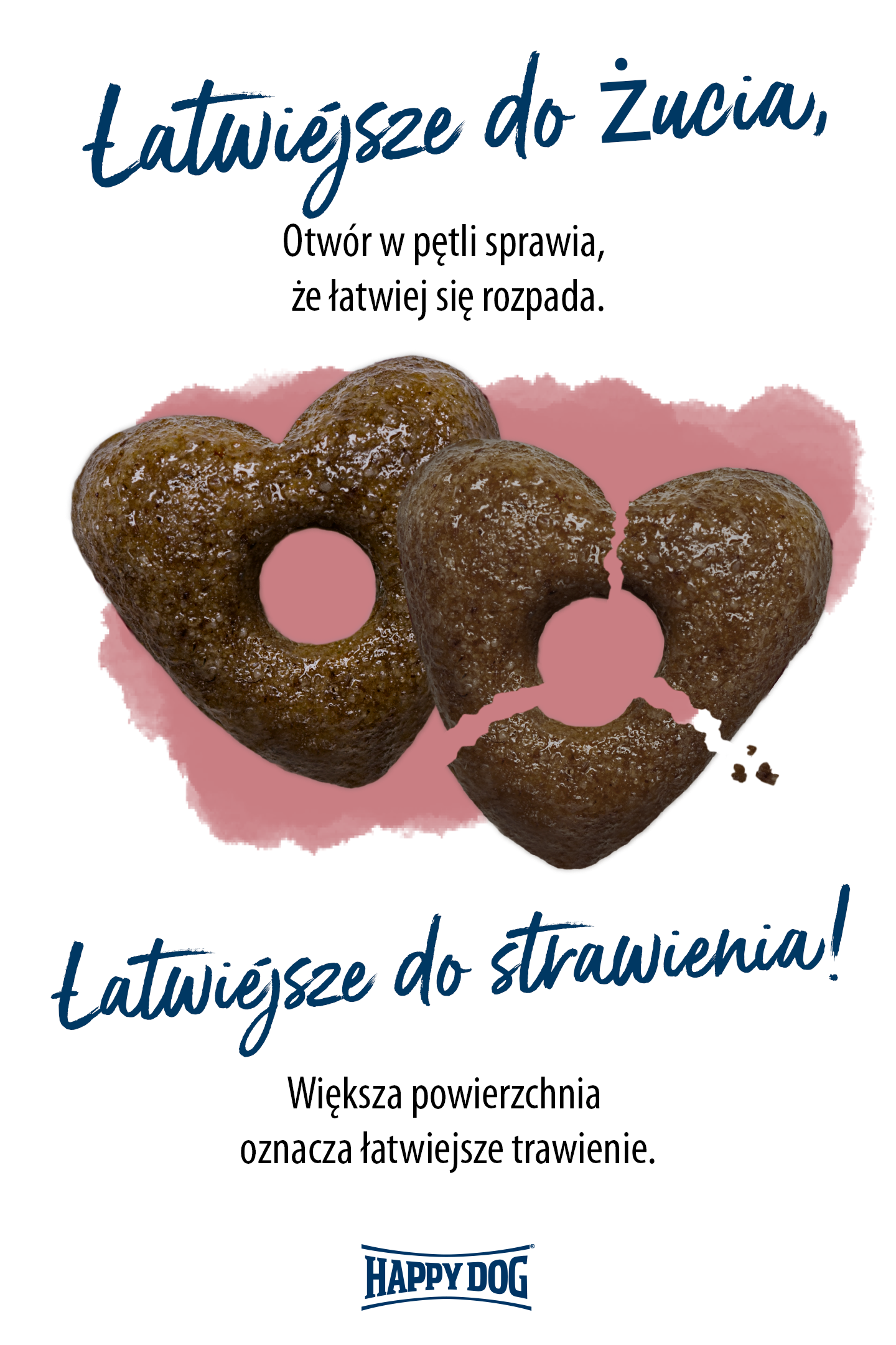 Unikalny kształt serca naszej karmy suchej sprawia że jest ona łatwiejsza do przeżuwania przez szczenięta. Dzięki dziurce krokiet szybciej pęka. Większa powierzchnia z kolei sprawia, że są one szczególnie łatwo trawione w układzie żołądkowo-jelitowym.