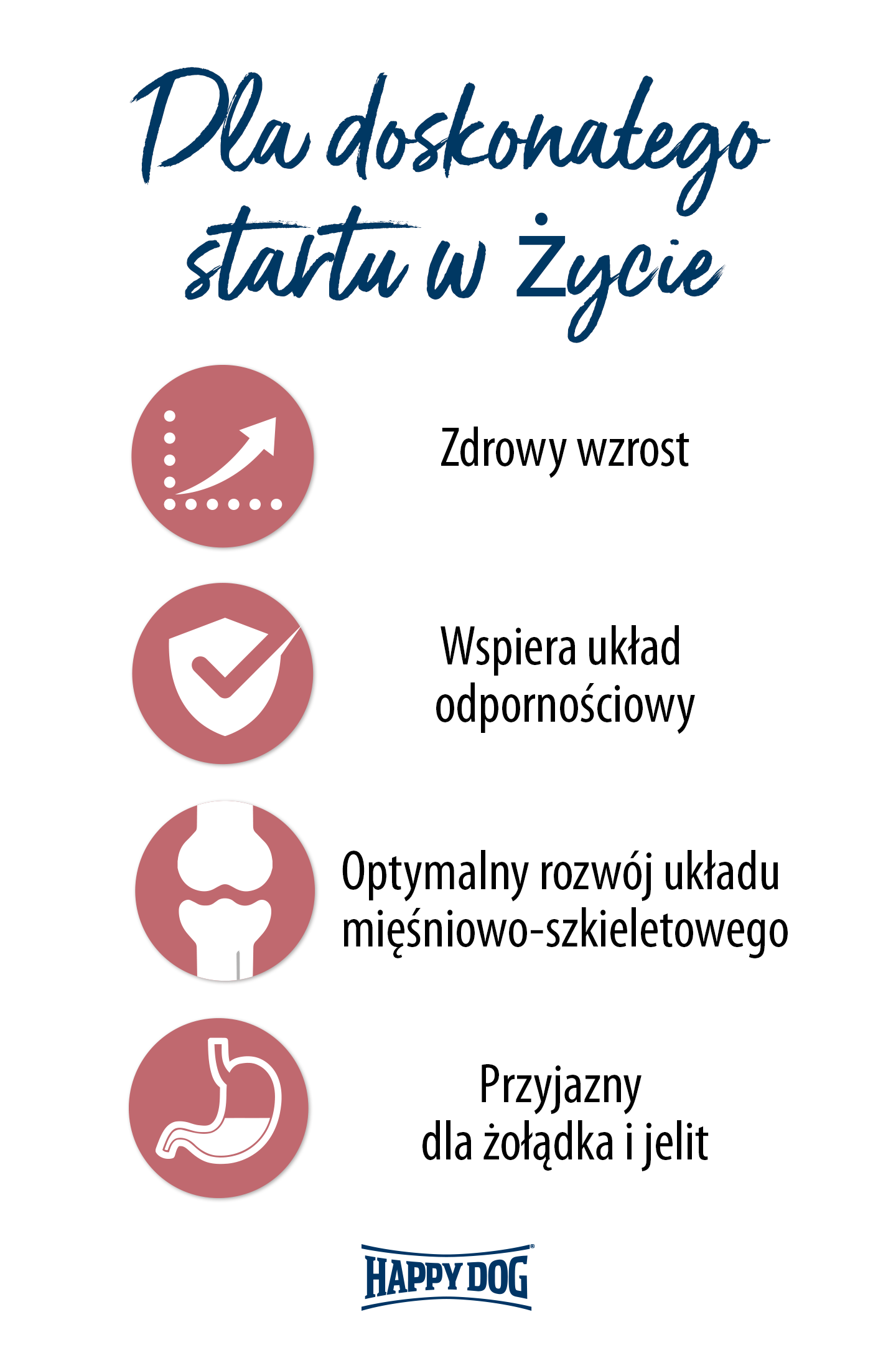 Aby Twój czworonożny towarzysz rósł zdrowo, jest ważna dieta dostosowana do jego rozwoju. Powinna być ona dostosowana do wieku i potrzeb młodego psa. Od 7 miesiąca życia młode psy kończą etap szczenięcy - i rosną znacznie wolniej. Od tej pory spowalnia również przyrost masy ciała. Nasza Happy Dog Sensible Junior Huhn, Lachs & Kartoffel (kurczak, łosoś & ziemniak) nadaje się szczególnie jako karma dla wrażliwych młodych psów, które nie są już w „głównej fazie wzrostu. Aby zapobiec żywieniowym zaburzeniom wzrostu, karma musi być dostosowana do umiarkowanego zapotrzebowania na białko i energię.