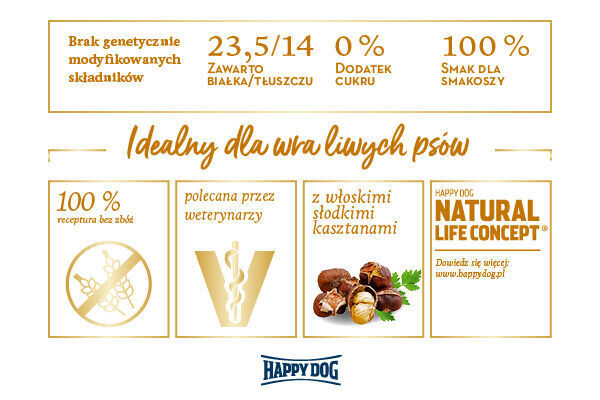 Dzięki włoskim kasztanom karma Happy Dog Sensible Piemonte jest nie tylko szczególnie smaczna dla Twojego czworonożnego przyjaciela. Dzięki bezglutenowej recepturze bez zbóż i ziemniaków, karma sucha jest idealna również dla psów z nietolerancjami pokarmowymi. Lekkostrawna kaczka, pyszna ryba morska i inne składniki oparte na naszej koncepcji Natural Life Concept® uzupełniają jej recepturę. Te starannie dobrane składniki i szczególnie delikatny proces produkcji sprawiają, że Happy Dog Piemonte jest idealną karmą dla świadomej diety. Również dla psów o specjalnych potrzebach. Krokiety są optymalnie dostosowane do uzębienia psów średnich i dużych ras. Aby optymalnie i odpowiednio do danego gatunku wspierać metabolizm psa, stosujemy naturalne składniki, co korzystnie wpływa na jego organizm. Siemię lniane, wybrane zioła, jabłko i małż nowozelandzki.