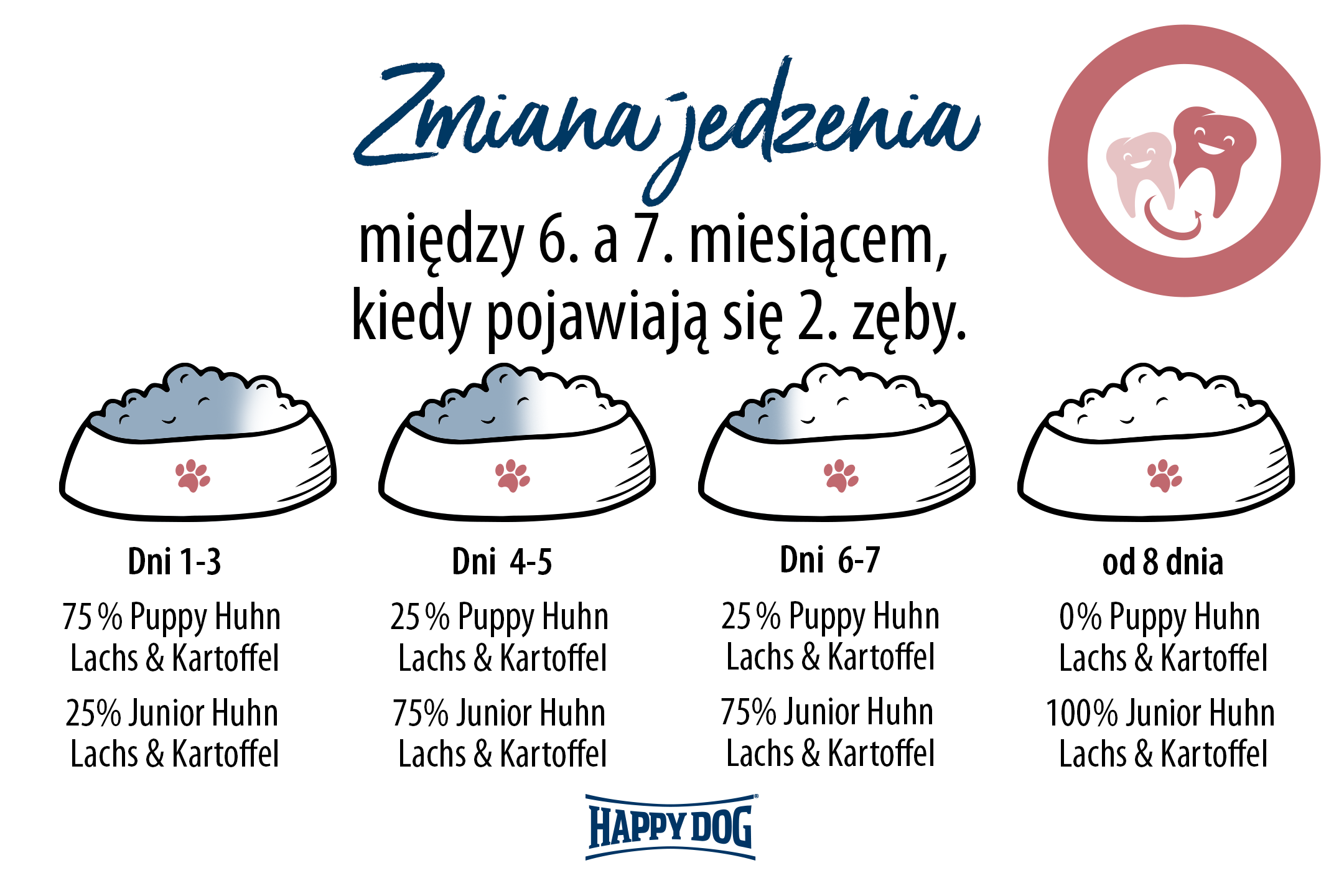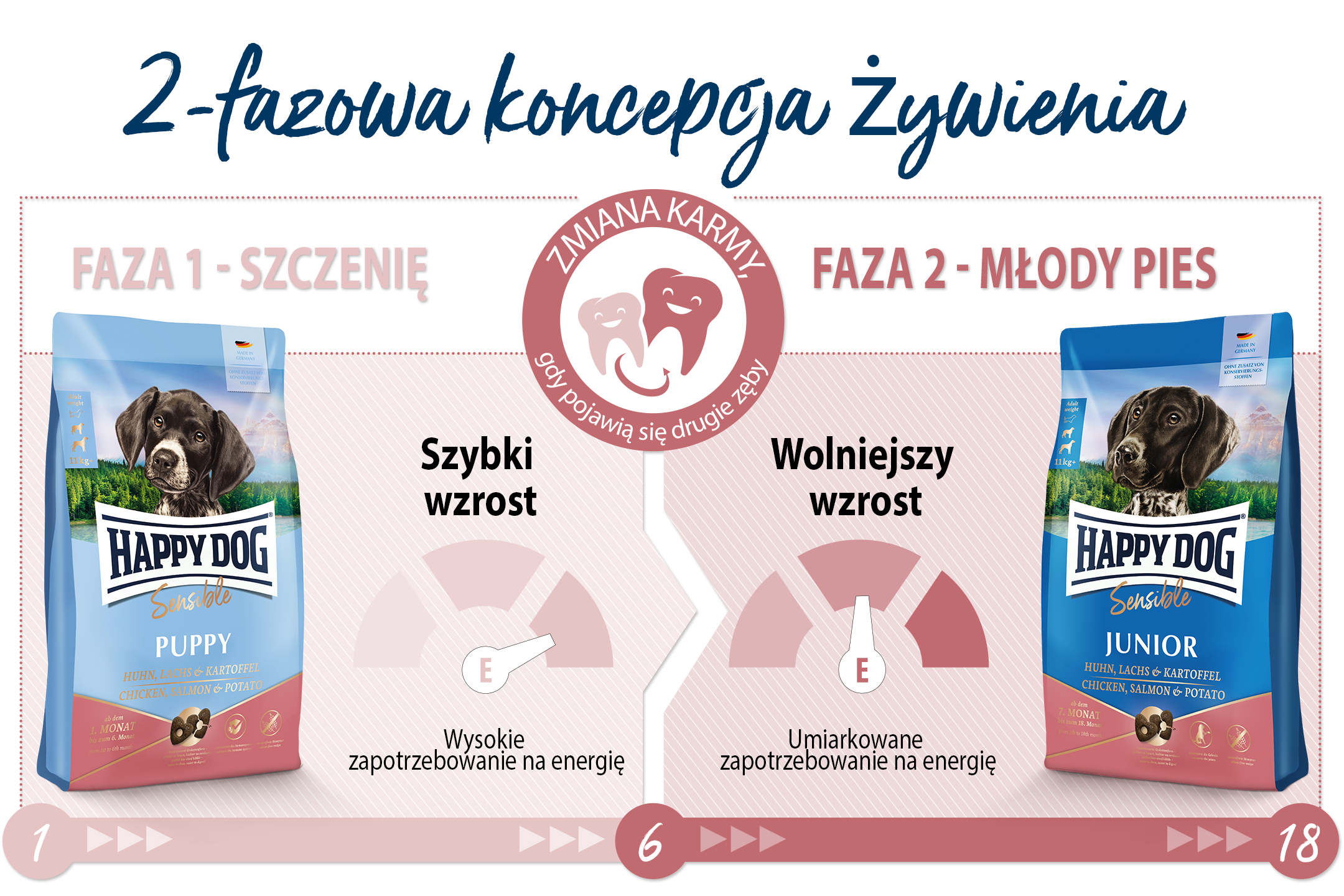 Karma Happy Dog Sensible Puppy Huhn, Lachs & Kartoffel (łosoś & ziemniak) nadaje się jako kompletna karma od 4. do 27. tygodnia życia Twojego szczeniaka. Po tym czasie należy stopniowo małymi krokami przechodzić na odpowiednią karmę dla młodych psów – na przykład na Happy Dog Sensible Junior Huhn Lachs & Kartoffel (Kurczak, łosoś & ziemniak).