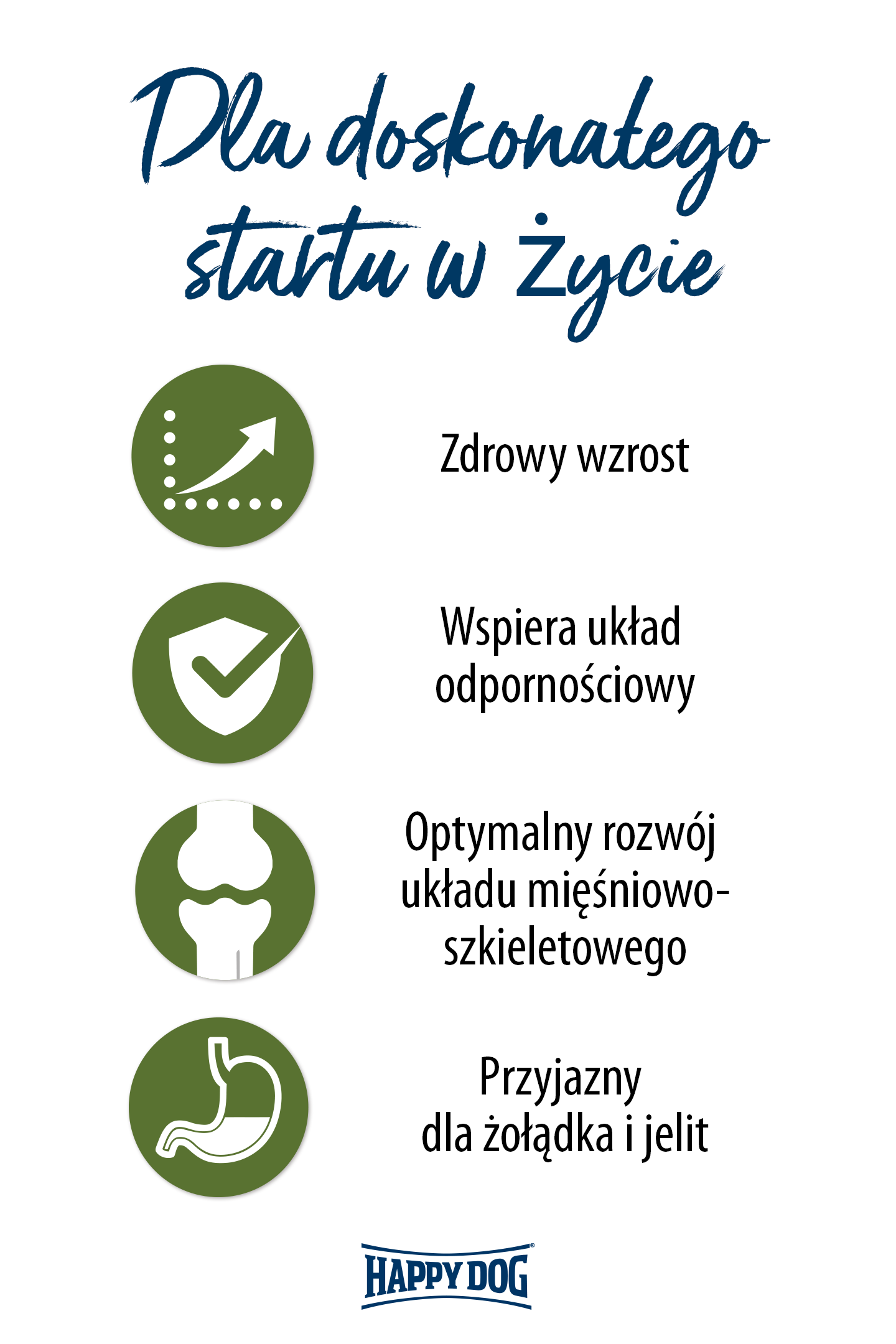 Dla naszych małych czworonożnych przyjaciół chcemy tylko tego, co najlepsze. Szczególnie w pierwszych tygodniach należy zwrócić uwagę na zdrową i zbilansowaną dietę, optymalnie dostosowaną do potrzeb szczeniąt. Nasza Happy Dog Sensible Puppy Lamm & Reis (jagnięcina i ryż) to połączenie dobrze tolerowanej jagnięciny z lekkostrawnym ryżem. Receptura niezawierająca drobiu jest szczególnie odpowiednia dla psów o wrażliwych żołądkach. Dodatek cennego małża nowozelandzkiego wspomaga harmonijny wzrost i zdrowy rozwój kości, ścięgien, więzadeł i stawów. Optymalny stosunek tłuszczów i białek zapewnia Twojemu małemu pupilowi idealną ilość ważnych składników. W oparciu o unikalną koncepcję Happy Dog Natural Life Concept® Twój pies otrzymuje wszystko to, co korzystnie wpływa na jego organizm i pozwala mu beztrosko rozpocząć długie i zdrowe psie życie.