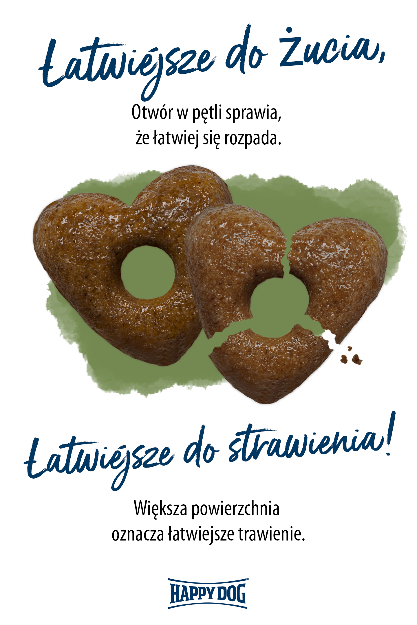 Specjalny kształt krokietów pomaga Twojemu czworonożnemu przyjacielowi w łatwym trawieniu. Dzięki dziurce krokiet szybciej pęka i jest szczególnie łatwy do gryzienia i trawienia. Ze względu na większą powierzchnię w żołądku jest optymalnie rozkładany przez soki trawienne.