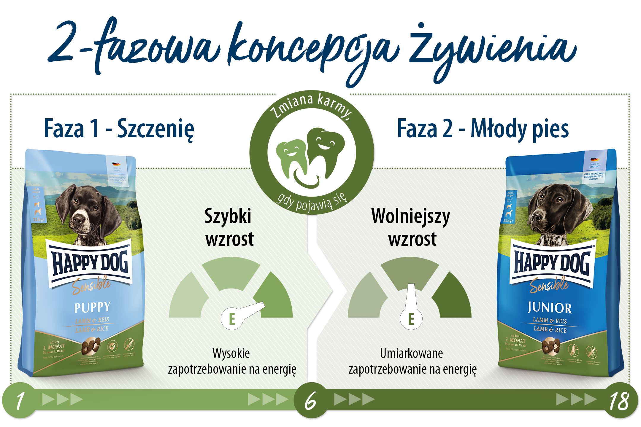 Od 4. tygodnia życia do 6. miesiąca życia włącznie Happy Dog Sensible Puppy Lamm & Reis (jagnięcina i ryż) jest idealna. Od 7. miesiąca życia należy powoli przechodzić z karmy dla szczeniąt na Happy Dog Sensible Junior Lamm & Reis (jagnięcina i ryż) . Ponieważ w fazie młodego psa Twój zwierzęcy członek rodziny rośnie wolniej – i dlatego potrzebuje zmniejszoną zawartość składników odżywczych.