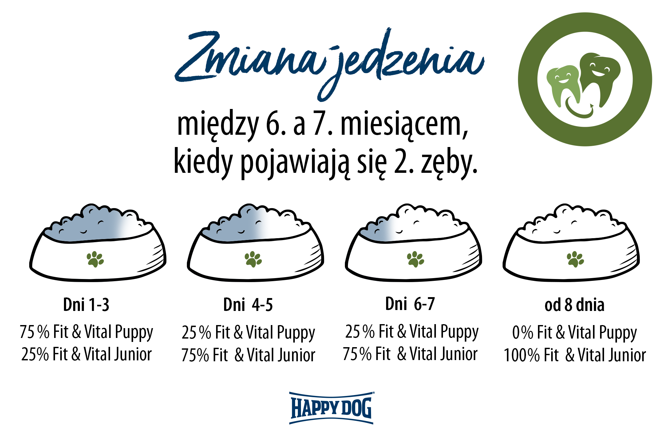 Od 27. tygodnia życia należy stopniowo przechodzić na odpowiednią karmę dla młodych psów