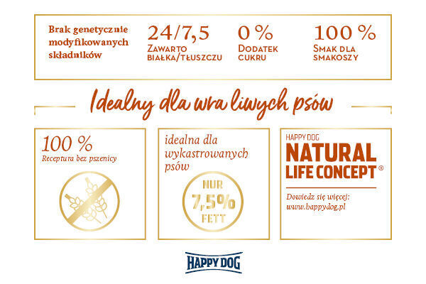 Umiarkowana zawartość tłuszczu na poziomie 7,5 % sprawia, że Happy Dog Toscana jest idealna dla psów wykastrowanych oraz psów, które wymagają diety niskotłuszczowej. Krokiety są optymalnie dostosowane do uzębienia dorosłych psów od 11 kg.