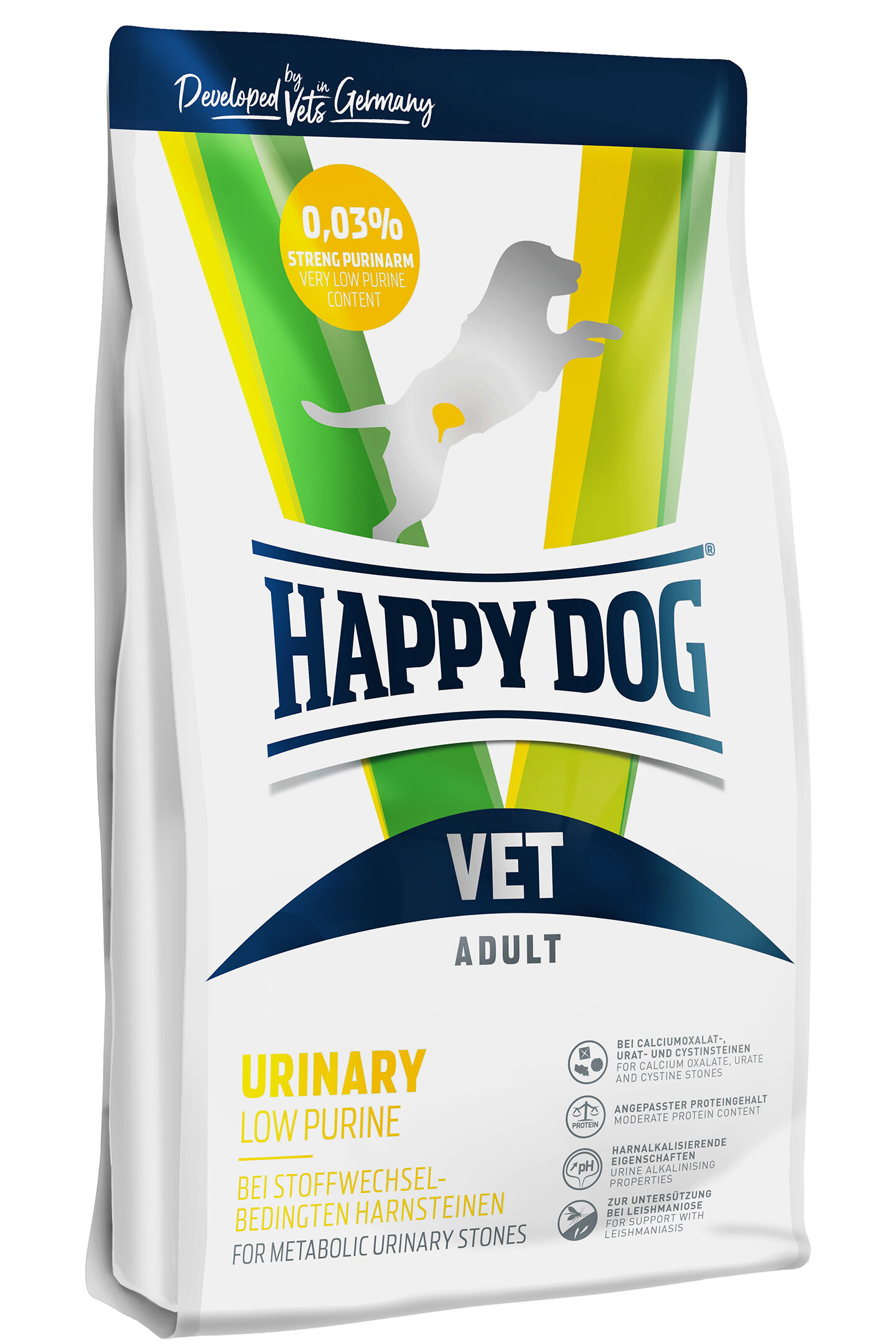 Happy Dog VET Diät Struvit stosuje się w celu rozpuszczenia kamieni struwitowych i ograniczenia nawrotów kamieni struwitowych u dorosłych psów. Ta dietetyczna, pełnoporcjowa karma zawiera wyjątkowo wysokowartościowe białko i charakteryzuje się obniżoną zawartością magnezu, fosforu, oraz właściwościom zakwaszającymi mocz, co skutkuje znacznym obniżeniem wartości pH moczu. Nieco zwiększona zawartość sodu, poprzez większe wchłanianie wody powoduje płukanie dróg moczowych. Wyśmienite zioła takie jak mniszek lekarski i pokrzywa są tradycyjnie stosowane jako uzupełnienie klasycznej terapii dróg moczowych.