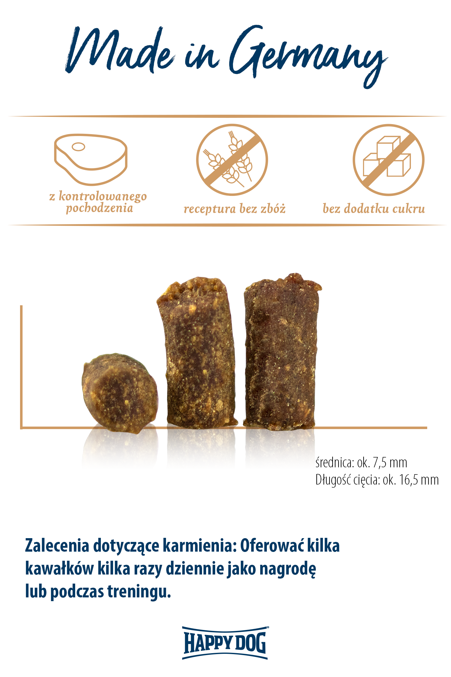 Bezzbożowa receptura z bezglutenowymi ziemniakami jest idealna zarówno dla wrażliwych jak i wymagających psów wszystkich wielkości i jest zalecana przez lekarza weterynarii w przypadku nietolerancji pokarmowych. Przekąski są łatwe do podzielenia i dlatego także idealnie nadają się podczas szkolenia, lub jako nagroda w przerwie między posiłkami. Oczywiście przekąski są produkowane bez dodatku cukru i konserwantów, a torebka ma praktyczne zamknięcie strunowe zapewniające długotrwałą świeżość. Dla nas zrównoważone, odpowiedzialne działanie i najwyższa jakość są na pierwszym miejscu, dlatego też mięso do naszych przekąsek mięsnych pochodzi z identyfikowalnych hodowli w Niemczech, ma najkrótszą możliwą drogę transportu i jest przetwarzane w delikatny sposób.