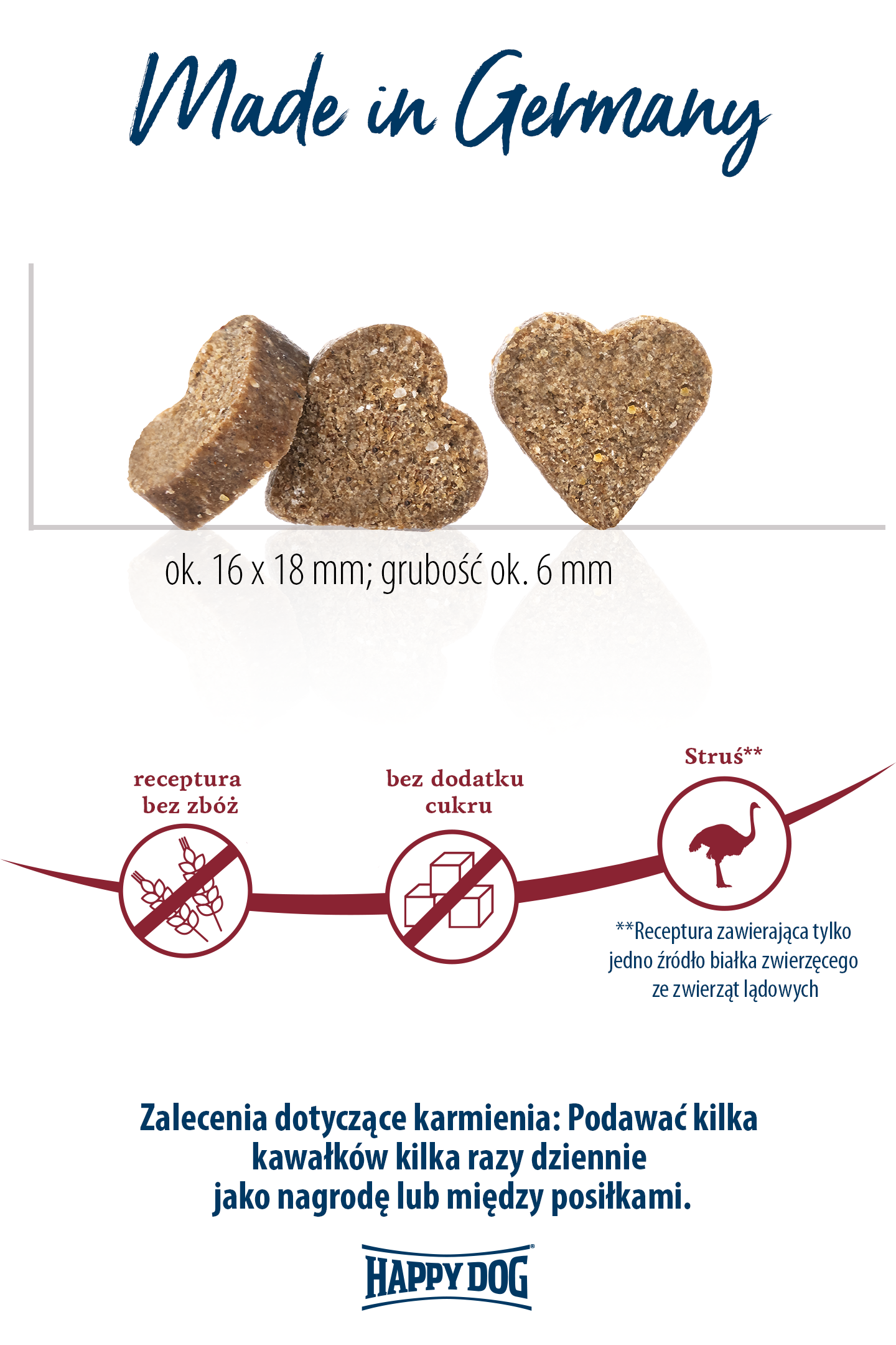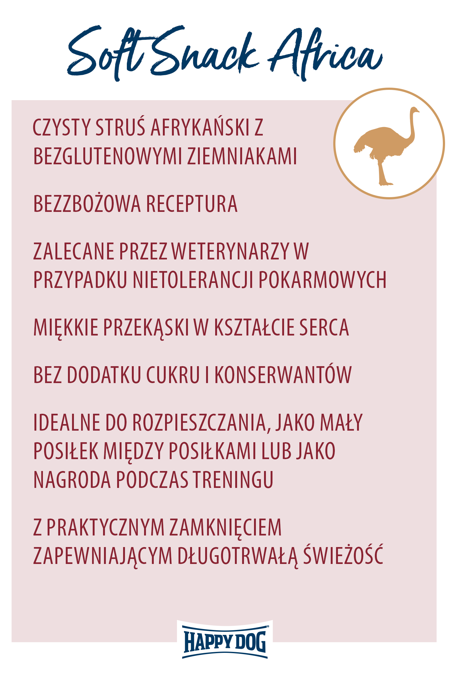 Miękkie przysmaki w kształcie serca Africa są idealne do rozpieszczania Twojego pupila lub jako małe przekąski między posiłkami. W tej smacznej przekąsce połączyliśmy rzadkie źródło białka, jakim jest struś, z bezglutenowym ziemniakiem. Bezzbożowa receptura jest również idealna dla wrażliwych i wymagających psów średnich i dużych ras i jest zalecana przez lekarzy weterynarii dla psów z nietolerancjami pokarmowymi. Przysmaki są produkowane bez dodatku cukru i konserwantów, a torebka ma praktyczne zamknięcie strunowe zapewniające długotrwałą świeżość. Podaruj swojemu futrzanemu przyjacielowi chwile rozpieszczania!