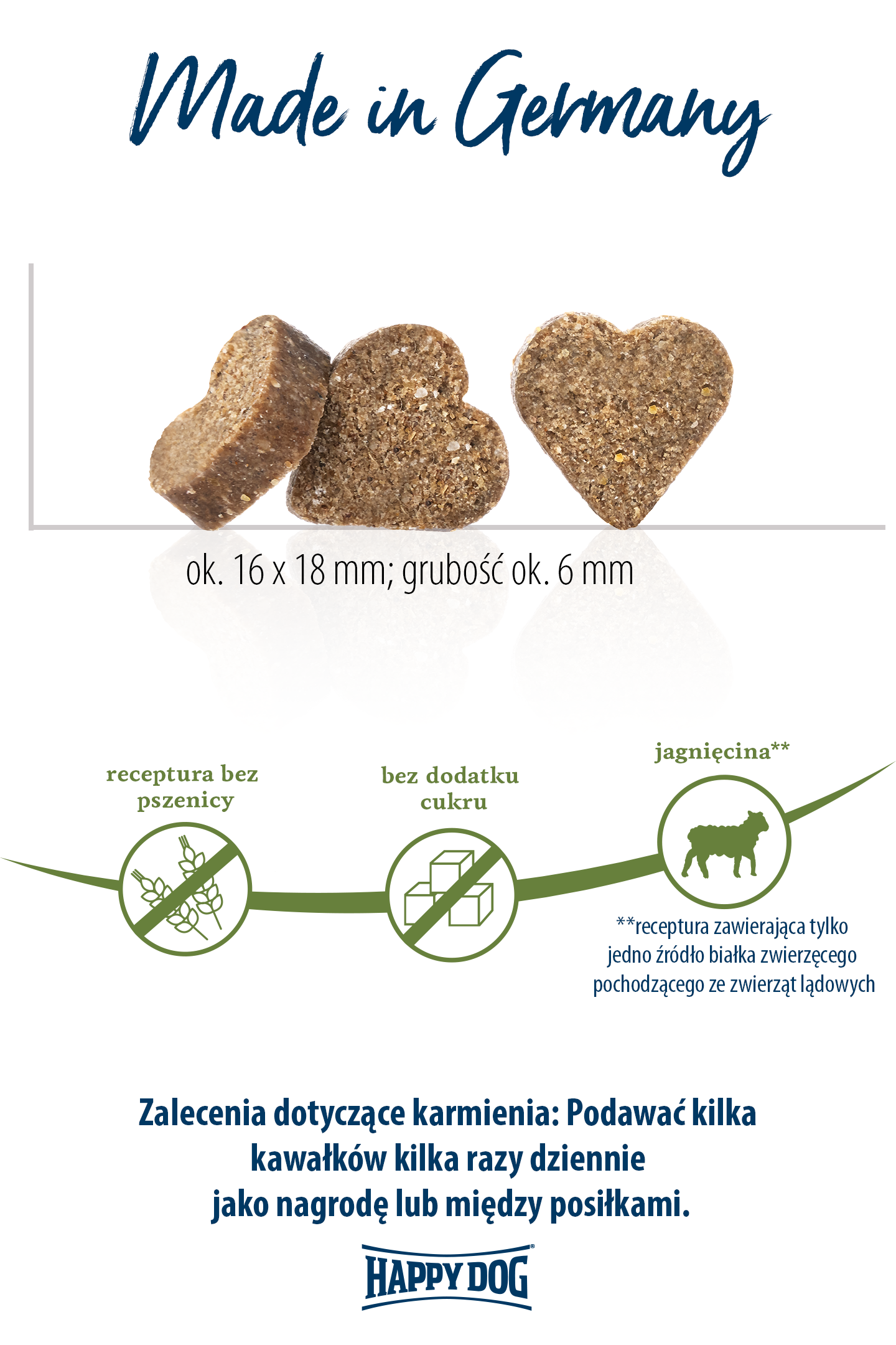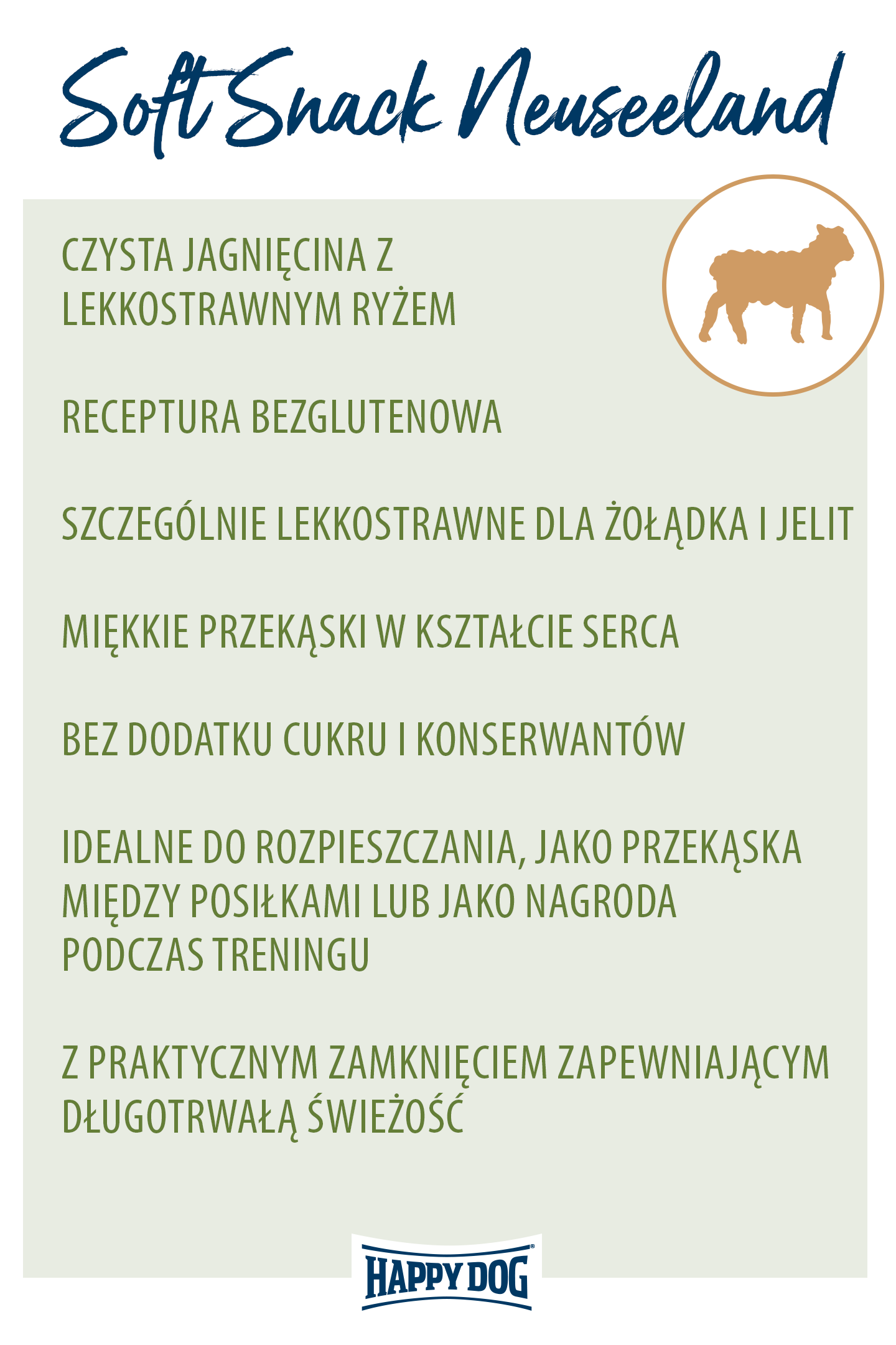 Miękki soczysty przysmak w kształcie serca Neuseeland jest idealny do rozpieszczania Twojego pupila lub jako mała przekąska między posiłkami. Delikatna jagnięcina i bardzo lekkostrawny ryż są wyjątkowo optymalnie tolerowane i szczególnie przyjazne dla żołądka i jelit. Bezglutenowa receptura oraz wielkość przysmaku w kształcie serca, dostosowana jest do potrzeb zarówno wrażliwych, jak i wymagających psów średnich i dużych ras. Te przysmaki są oczywiście produkowane bez dodatku cukru i konserwantów. Torebki mają praktyczne zamknięcie strunowe zapewniające długotrwałą świeżość. Dla wspaniałych chwil przyjemności!